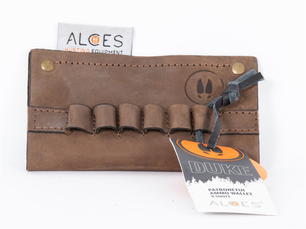 Alces Duke -patruunatasku on laadukas ruskeasta nahasta valmistettu patruunapidike. Patruunataskuun mahtuu kuusi patruunaa.