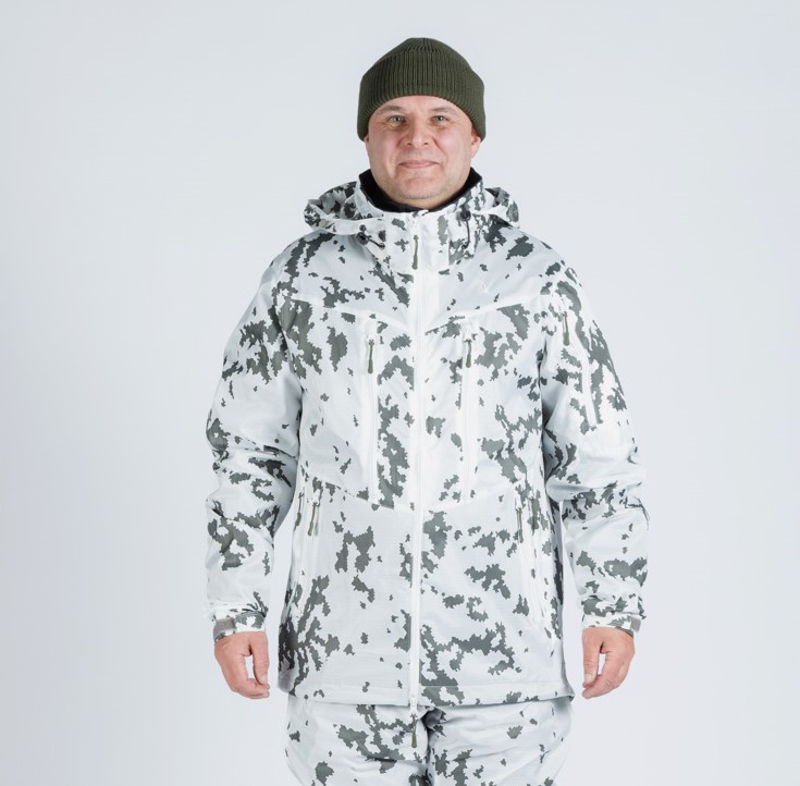 Kangas on painettu M05 Lumikuviolla. Kankaiden väritys täyttää puolustusvoimien visuaaliset ja IR-valon heijastusvaatimukset.